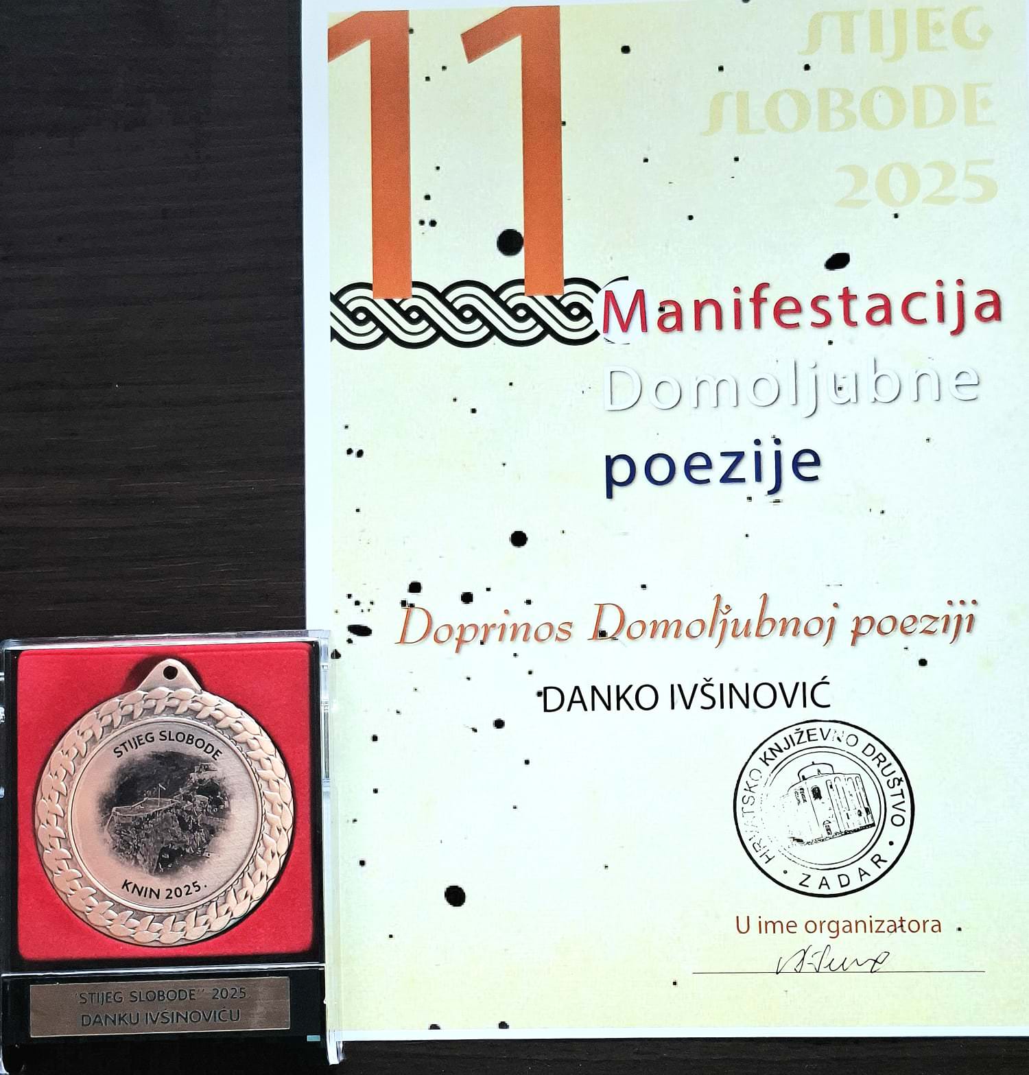 Najbolje iz Like / 03. Kolovoz 2025.Na XI. po redu pjesničkoj manifestaciji Domoljubne poezije „Stijeg slobode, Knin- 2025“ održanoj 2. kolovoza na ljetnoj pozornici Kninske tvrđave pod visokim pokroviteljstvom Ministarstva hrvatskih branitelja gospićki pjesnik Danko Ivšinović nastupio je po četvrti put na finalnoj večeri, ovog puta, izvan konkurencije i dobio nagradu za Doprinos Domoljubnoj poeziji. Istu nagradu dobila je Udruga Frankopan iz Zagreba. Nakon što mu je ministar vanjskih i europskih poslova Goran Grlić Radman uručio nagradu za doprinos domoljubnoj poeziju STIJEG SLOBODANE gospićki pjesnik Danko Ivšinović izrecitirao svoju domoljubnu pjesmicu " Moja Domovina " i izazvao erupciju oduševljenja na Kninskoj tvrđavi.