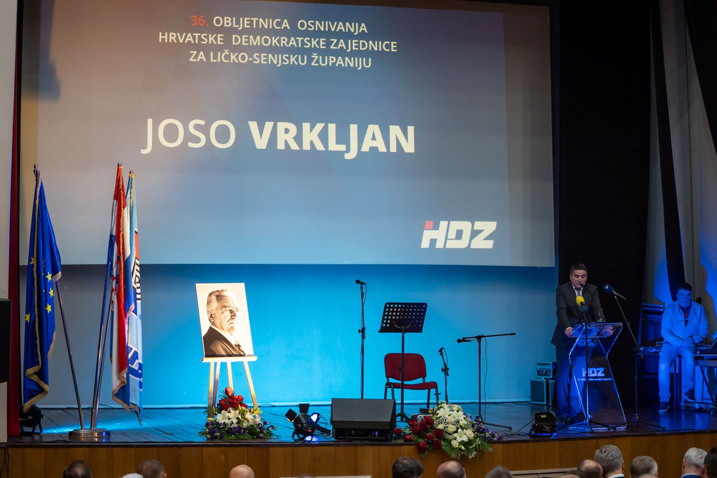 Okupljenima se obratio i predsjednik Gradske organizacije HDZ-a Grada Gospića Joso Vrkljan, koji je zahvalio vrhu stranke i Vlade Republike Hrvatske na dolasku u Gospić te na tome što su svojim dolaskom uveličali proslavu obljetnice. U govoru se osvrnuo na osnivanje stranke i njezine utemeljitelje, podsjetivši na političku viziju prvoga hrvatskog predsjednika dr. Franje Tuđmana i na povijesnu ulogu HDZ-a u stvaranju samostalne hrvatske države.