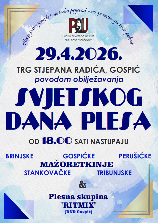 Najbolje iz Like / 27. Travanj 2026.U srijedu, 29. travnja 2026. godine, u Gospiću će se obilježiti Svjetski dan plesa prigodnim programom na Trgu Stjepana Radića.