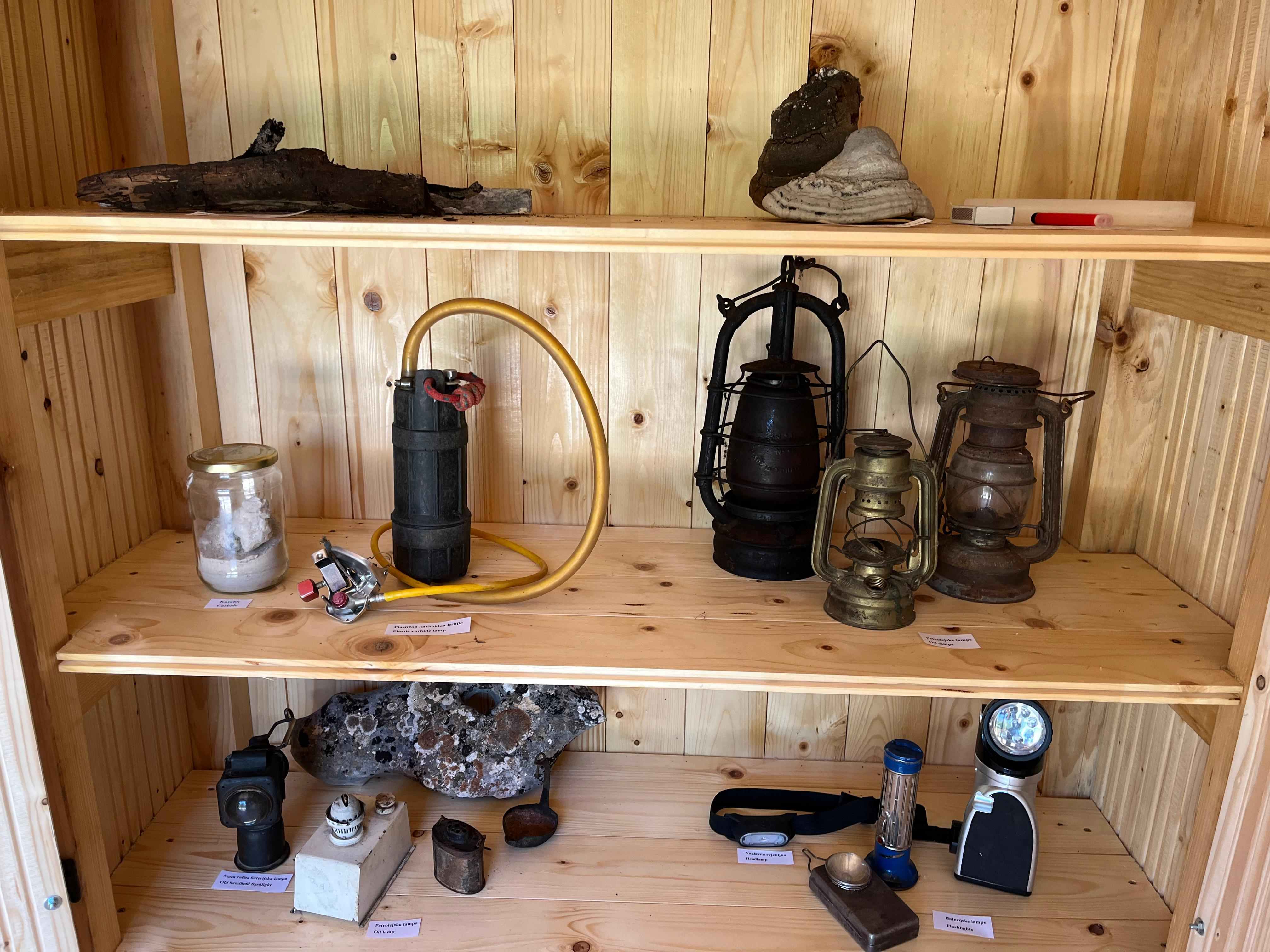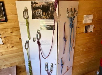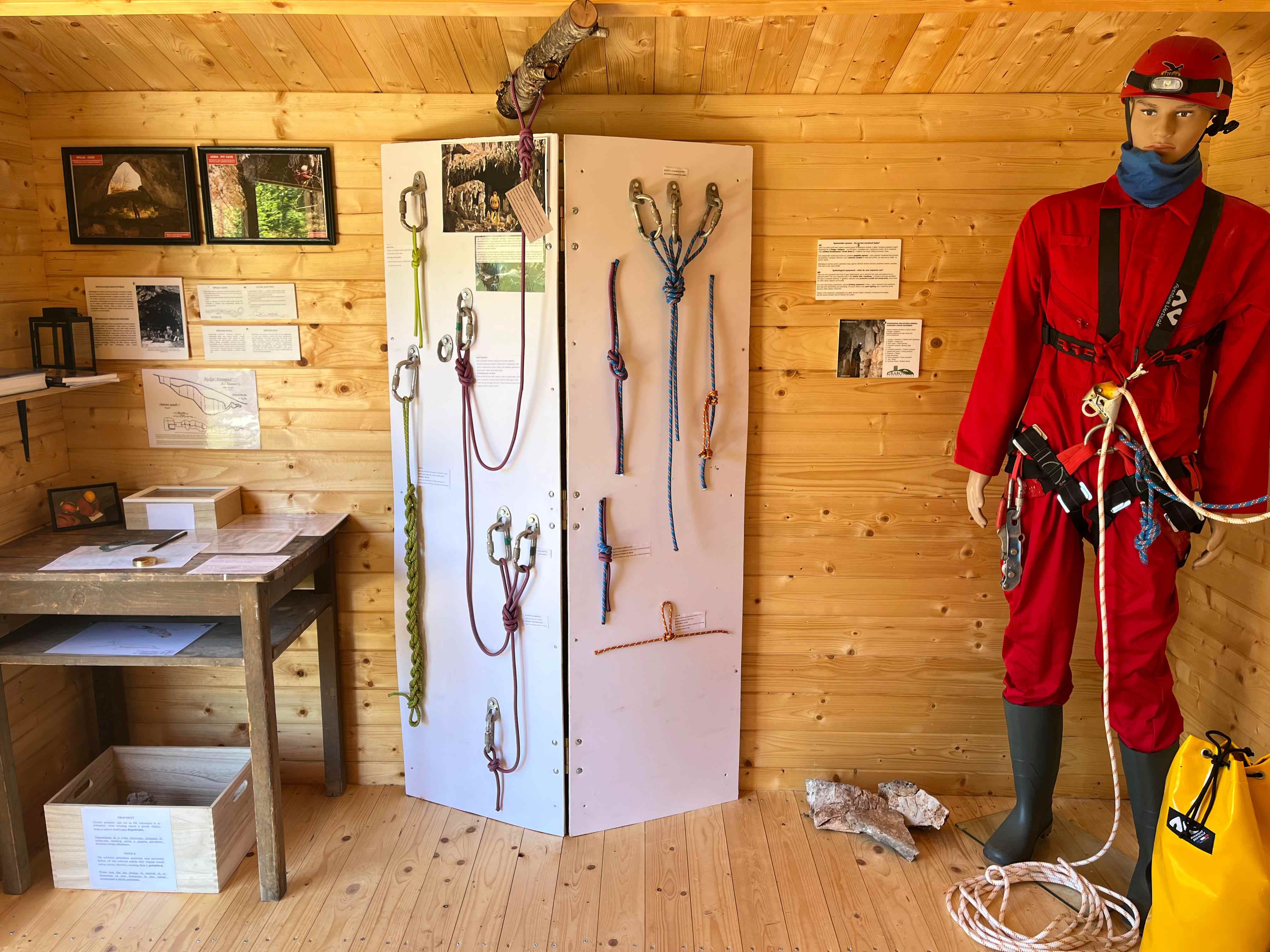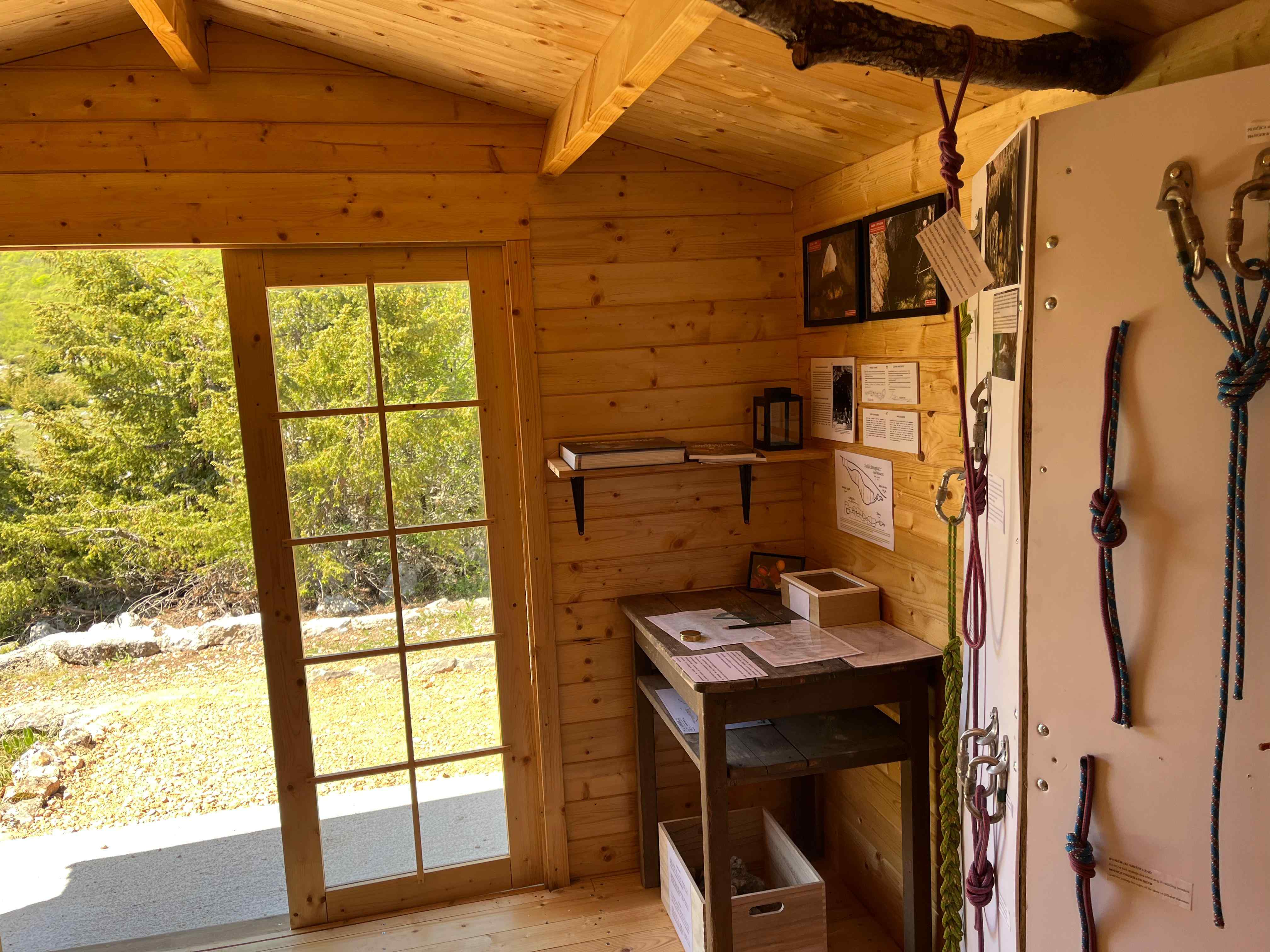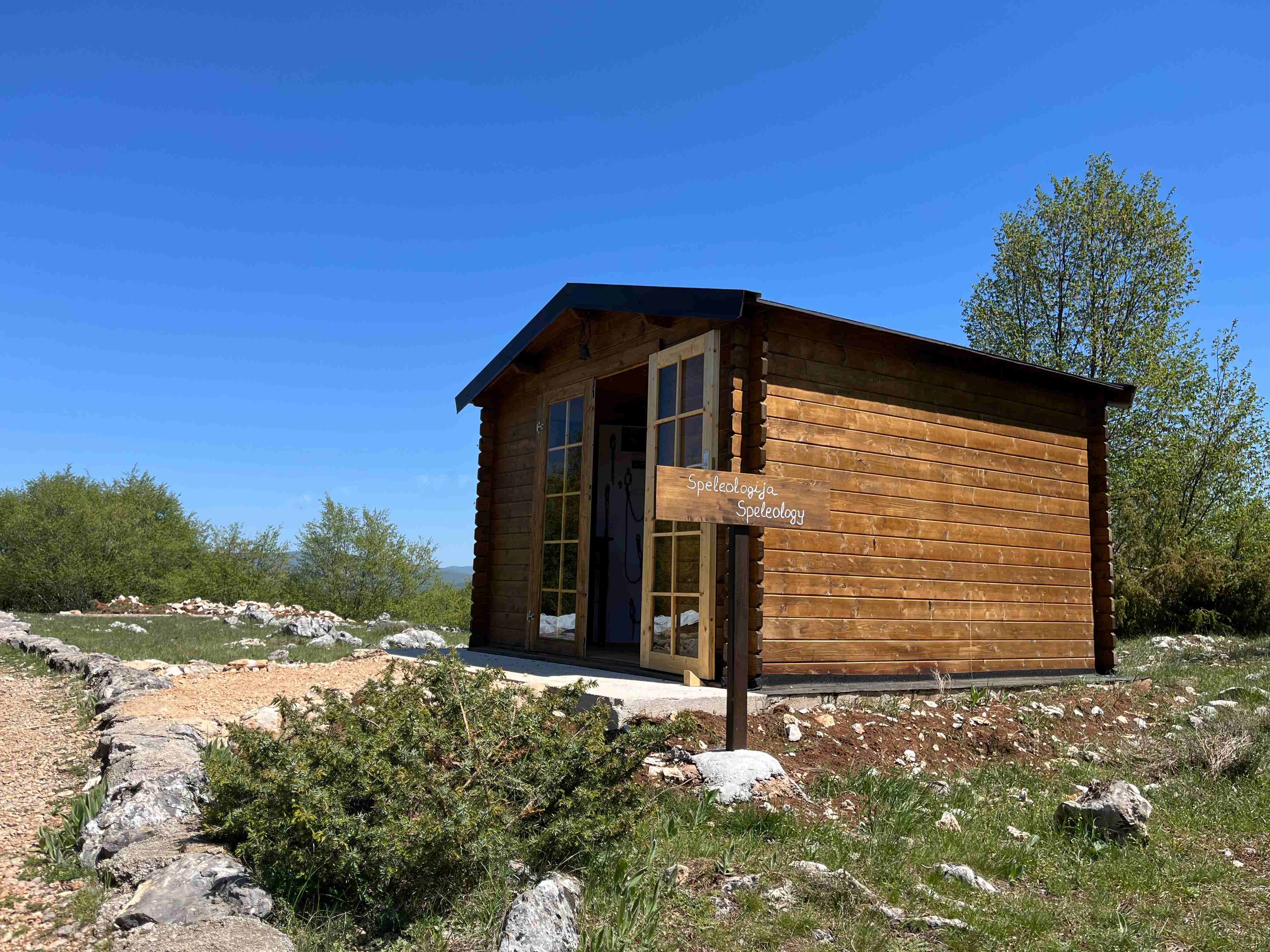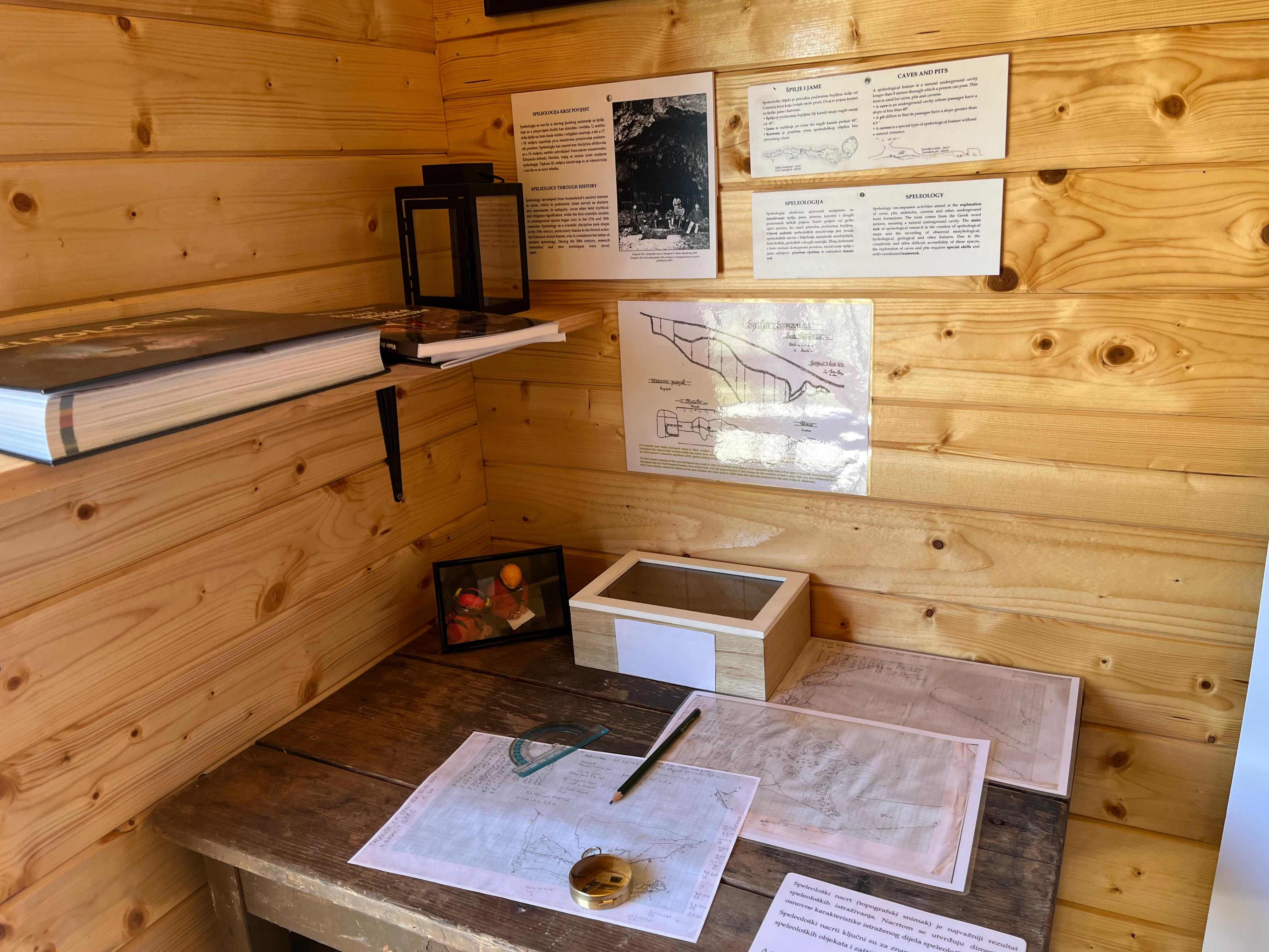 U sklopu Interpretacijskog centra planirano je postavljanje deset drvenih kućica različitih tematskih cjelina. Prva kućica posvećena je speleologiji te sadrži izložbeni postav koji prikazuje razvoj speleološke djelatnosti kroz povijest – od prvih istraživanja i primitivnih alata do suvremene tehnologije koja se danas koristi u istraživanju špilja. Posjetitelji imaju priliku vidjeti speleološku opremu, razvoj rasvjete korištene u istraživanjima, mjerne instrumente te se upoznati s načinima izrade speleoloških nacrta, kao i brojnim drugim zanimljivostima vezanima uz speleologiju. U sklopu projekta „Mali čuvari podzemnog svijeta“ financiranog od strane zaklade Adris, pokraj speleološke kućice postavljena je šesterokutna penjalica – multifunkcionalni edukativni poligon koji služi stručnim službama Parka tijekom radionica i vođenih edukacija. Na interaktivan način te uz pomoć penjalice, djeca će učiti o osnovama speleologije, kretanju po speleološkom terenu te o važnosti očuvanja podzemnih sustava.