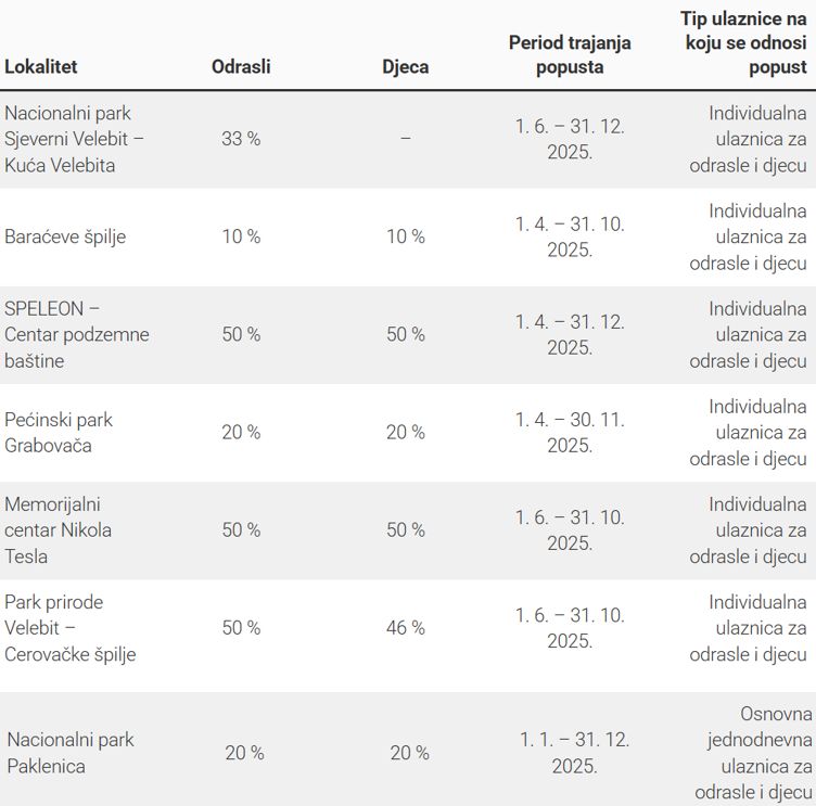 Popust se ostvaruje isključivo na blagajni pojedinog lokaliteta, uz prezentaciju ulaznice za Plitvička jezera. Odnosi se na redovnu cijenu individualne ulaznice i vrijedi jednokratno, za onoliko ulaznica koliko je kupljeno za NP Plitvička jezera tijekom 2025. godine.
