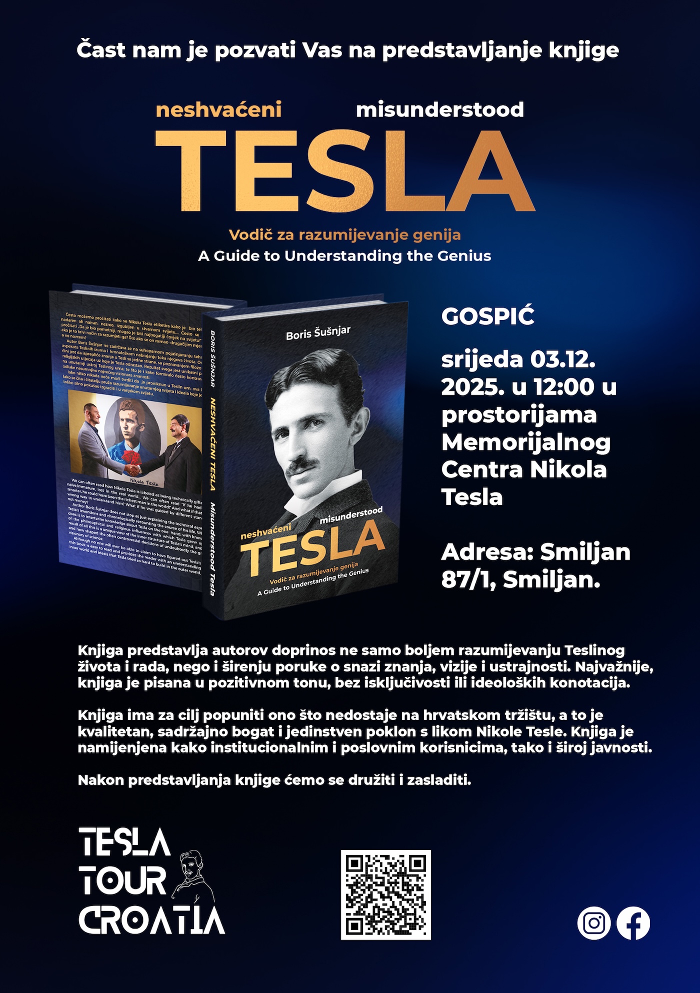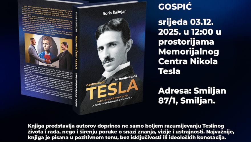 Najbolje iz Like / 29. Studeni 2025.U Gospiću će 3. prosinca biti predstavljena knjiga „Neshvaćeni Tesla – vodič za razumijevanje genija“ autora Borisa Šušnjara, posebnog interpretatora života i rada Nikole Tesle, koji godinama sudjeluje u brojnim znanstvenim, edukativnim i turističkim projektima posvećenima najpoznatijem hrvatskom izumitelju. Predstavljanje će se održati u srijedu, 3. prosinca 2025. u 12 sati, u prostorijama Memorijalnog centra Nikola Tesla u Smiljanu.
