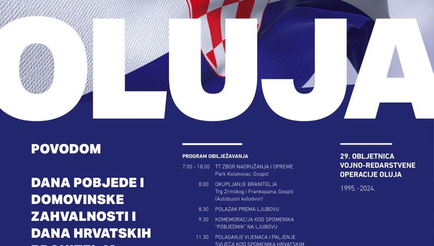 Najbolje iz Like / 26. Srpanj 2024.Dana 5. kolovoza 2024. godine u organizaciji Ministarstva hrvatskih branitelja, Ličko-senjske županije, Grada Gospića i Koordinacija udruga proizišlih iz Domovinskog rata na lokaciji Ljubovo i Gospić svečano će se obilježiti Dan pobjede i domovinske zahvalnosti, Dan hrvatskih branitelja, kao i 29. obljetnica vojno-redarstvene operacije "Oluja".
