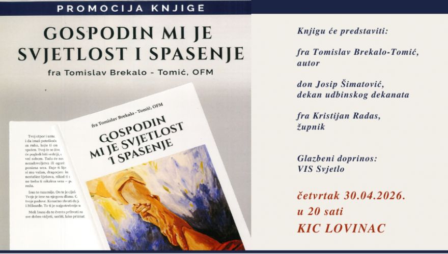 Najbolje iz Like / 27. Travanj 2026.Kulturno-informativni centar Lovinac poziva vas na predstavljanje knjige „Gospodin mi je svjetlost i spasenje“ autora fra Tomislava Brekala – Tomića, koje će se održati u četvrtak, 30. travnja 2026. godine s početkom u 20 sati