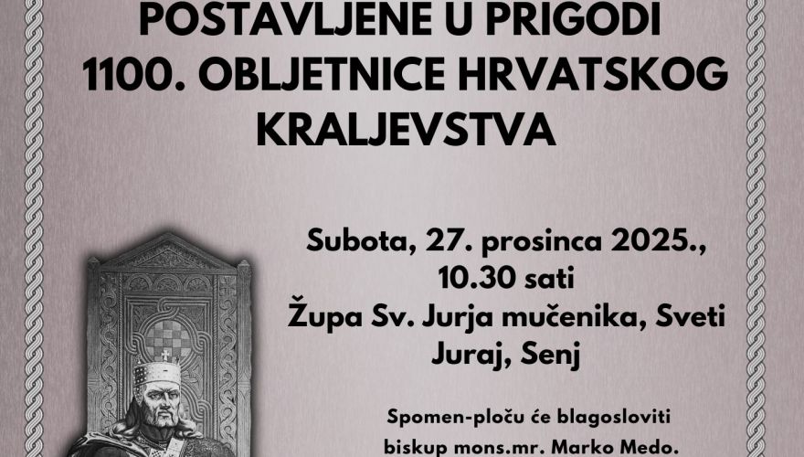 U povodu obilježavanja 1100. obljetnice Hrvatskoga Kraljevstva, u subotu, 27. prosinca 2025., u primorskom mjestu Sveti Juraj kraj Senja održat će se svečano otkrivanje spomen-ploče posvećene ovom iznimno važnom jubileju hrvatske povijesti i državnosti. Svečani program započinje u 10.30 sati svetom misom u Župi Svetoga Jurja Mučenika u Svetom Jurju.