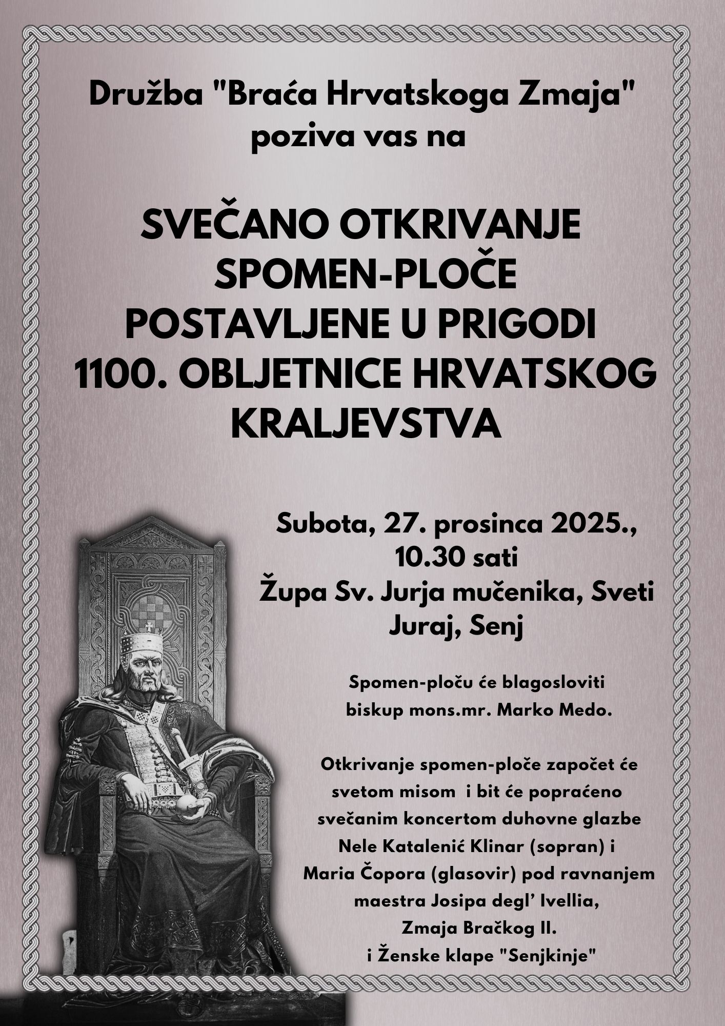 Svečano otkrivanje spomen-ploče u povodu obilježavanja 1100. obljetnice Hrvatskoga Kraljevstva bit će dodatno uveličano svečanim koncertom duhovne glazbe. Nastupit će Nela Katalenić Klinar (sopran), Mario Čopor (glasovir) pod ravnanjem maestra Josipa degl' Ivellia te Ženska klapa „Senjkinje“, čime će se programu dati osobita umjetnička i duhovna dimenzija.