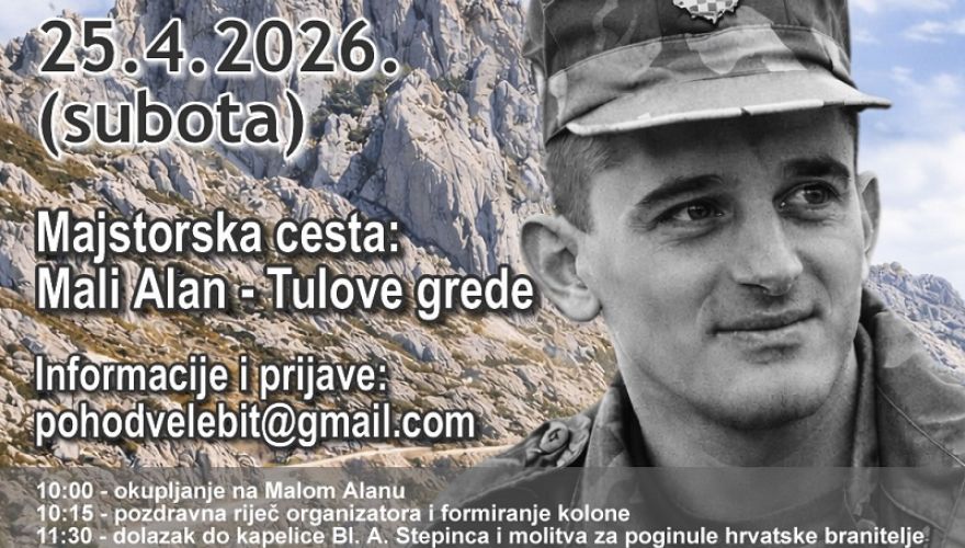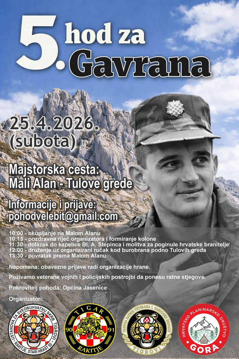 Najbolje iz Like / 15. Travanj 2026.U organizaciji Ustanove za sveobuhvatnu skrb Tigrovi, Udruge Tigar 90.-91. Rakitje, Udruge ratnih veterana 1. gardijske brigade Tigrovi i Hrvatskog planinarskog društva Gora, uz pokroviteljstvo Općine Jasenice, u subotu 25. travnja održat će se 5. hod za Gavrana.